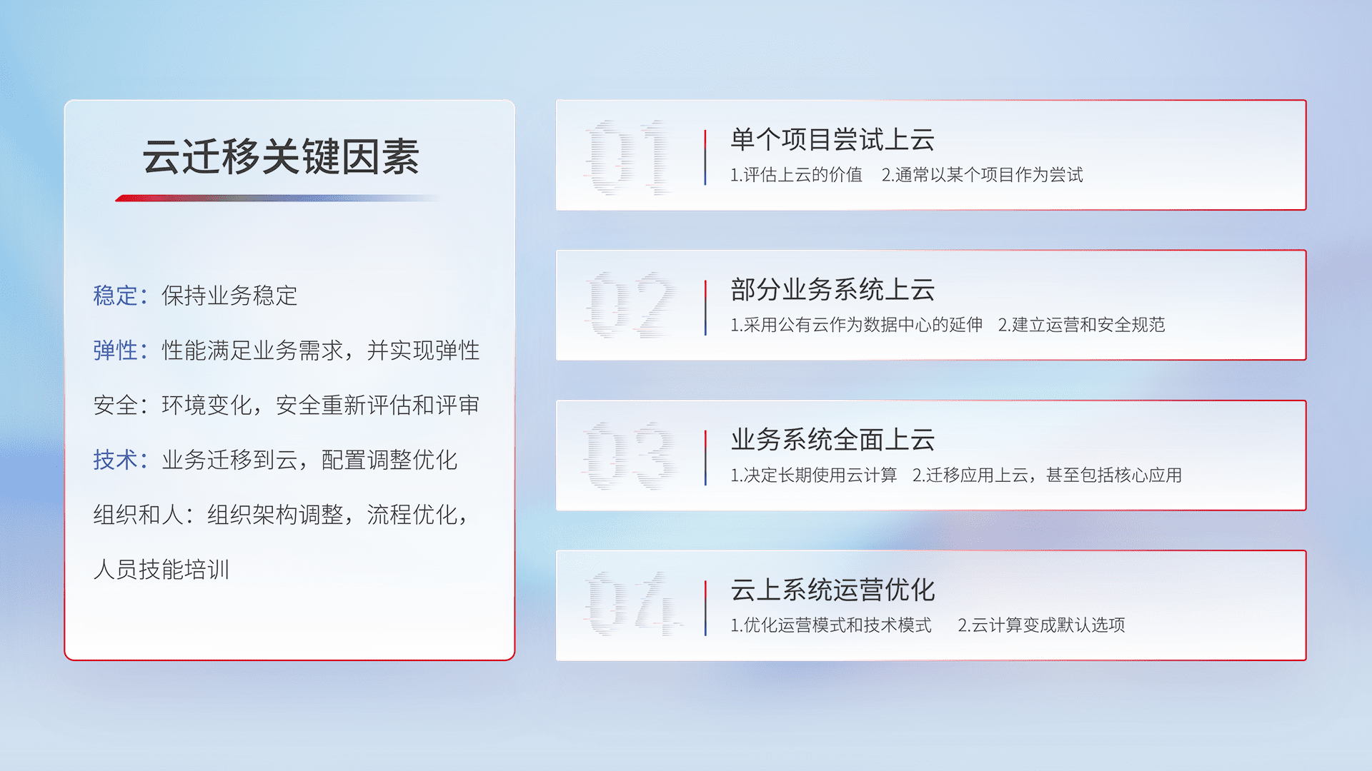 结合实际业务,,,从规划设计、、、、云平台选型、、、、云原生改造、、、数据迁移、、、、集成交付,,,,迁移全过程为客户识别最佳上云路径,,,,做好风险识别管理,,,,设计网络架构、、身份权限、、安全审计合规、、、、操作审计、、、日志审计、、监控告警策略、、多站点容灾设计等,,,对云上基础设施进行整体规划,,,提升IT治理水平,,以满足弹性、、高可用、、、、高性能的需求。。。