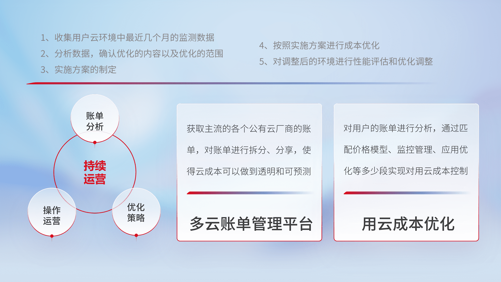 通过多云纳管,,以统一的资源数据模型把客户的云资源进行抽象和封装,,进而实现对多云资源的统一操作,,保障云资源管理的可靠性、、稳定性与可用性。。。。量身定制化运维内容,,配置、、、开发运维、、补丁管理、、、、备份、、监控、、、、认证和访问管理、、、、审计和日常巡检等,,,保障在用云过程中的可靠度,,,稳定度以及高可用率。。。。